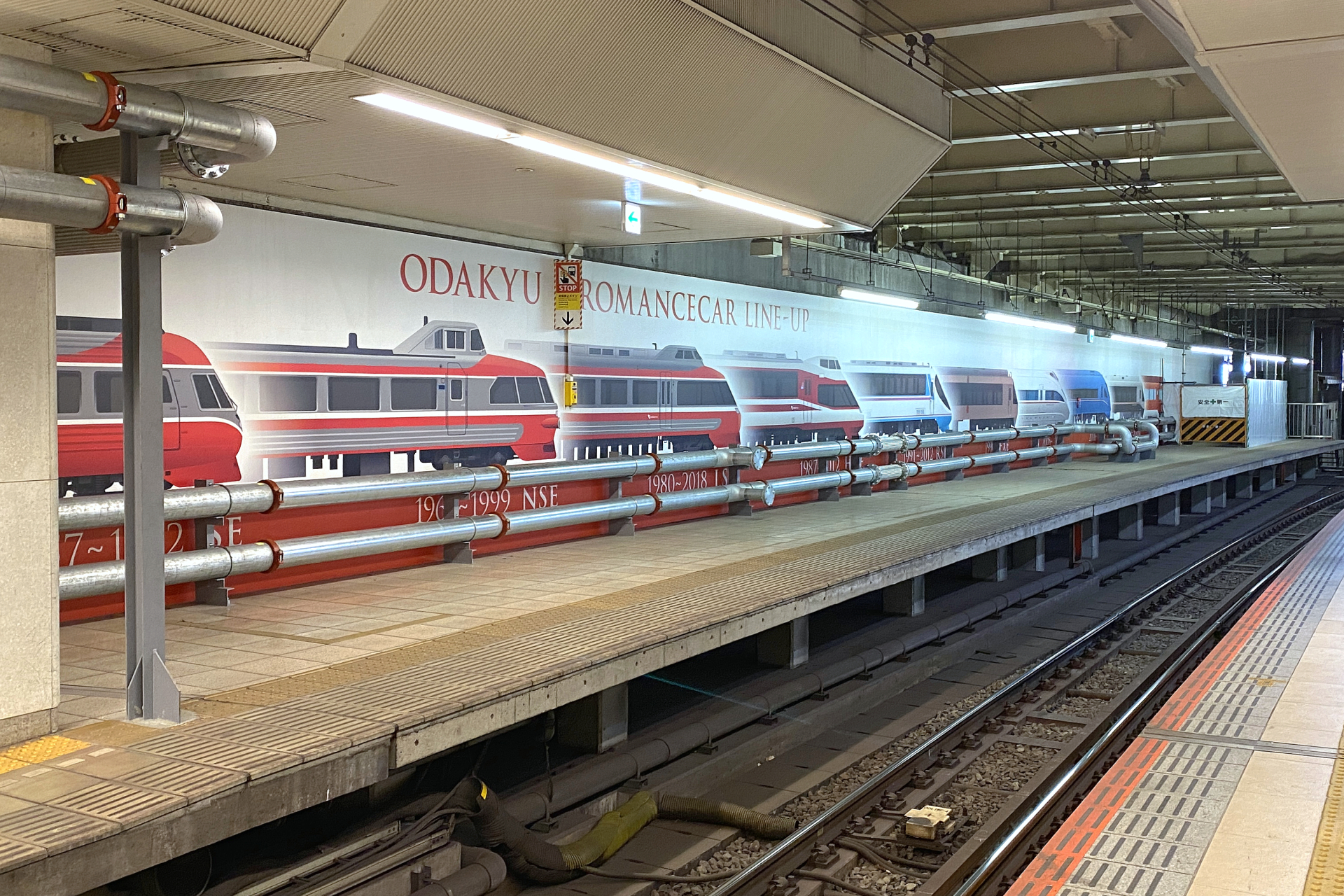 乗降用には使われていませんが、新宿の1番ホームにはロマンスカーのイラストが描かれている壁があり、他のホームからもよく見えます。場所は小田原方の端にある壁で、歴代のロマンスカーを側面から見た姿が描かれており、3000形(SE)から最新型の70000形(GSE)までが並んでいます。