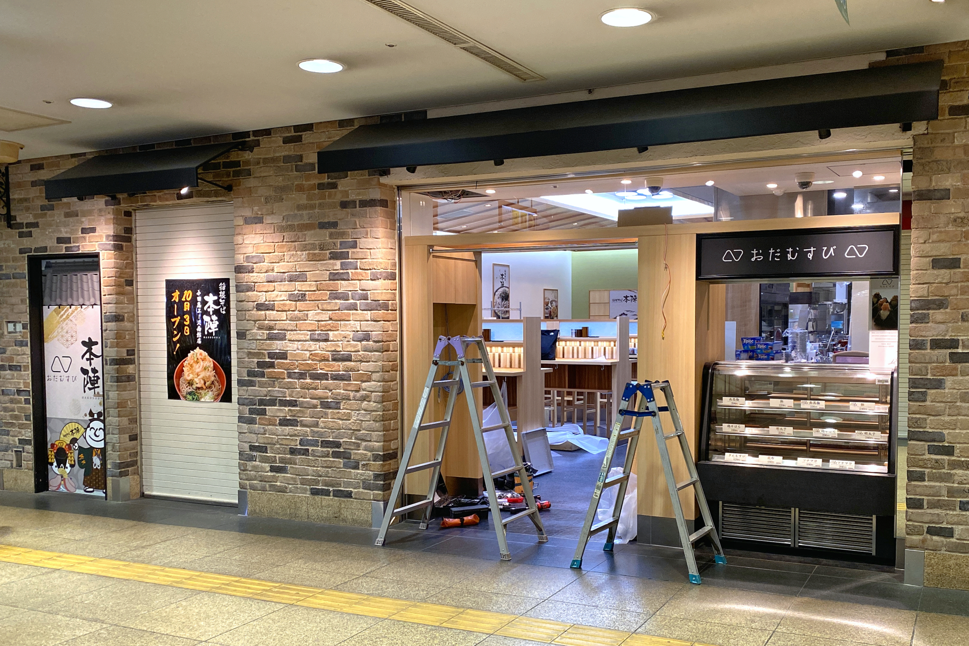 先日乗り換えのために小田急エースの中を歩いていたところ、工事中の店舗が目に留まりました。よく見ると、そこには箱根そば本陣と書かれていますが、おだむすびの文字もあったのです。