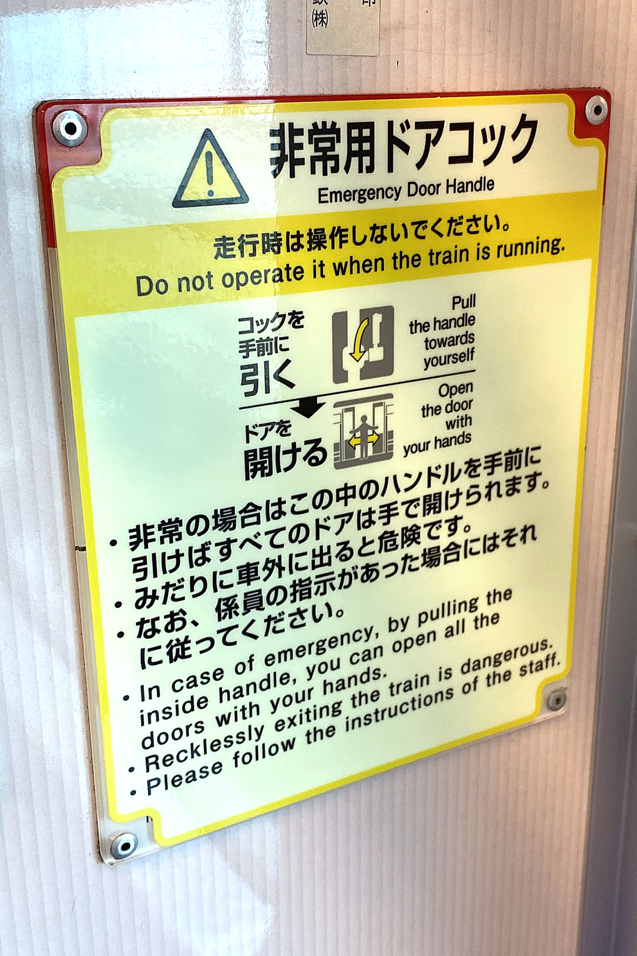昔ながらのプレートを見る機会は減ってきましたが、最近では非常用ドアコックの表記等が切り替えられています。