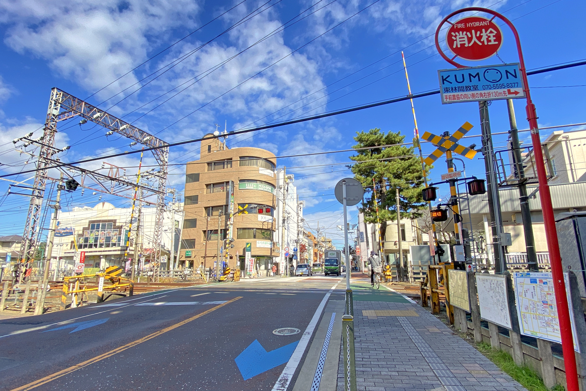 目の前に東林間駅の東口があり、印象的な風景の踏切です。