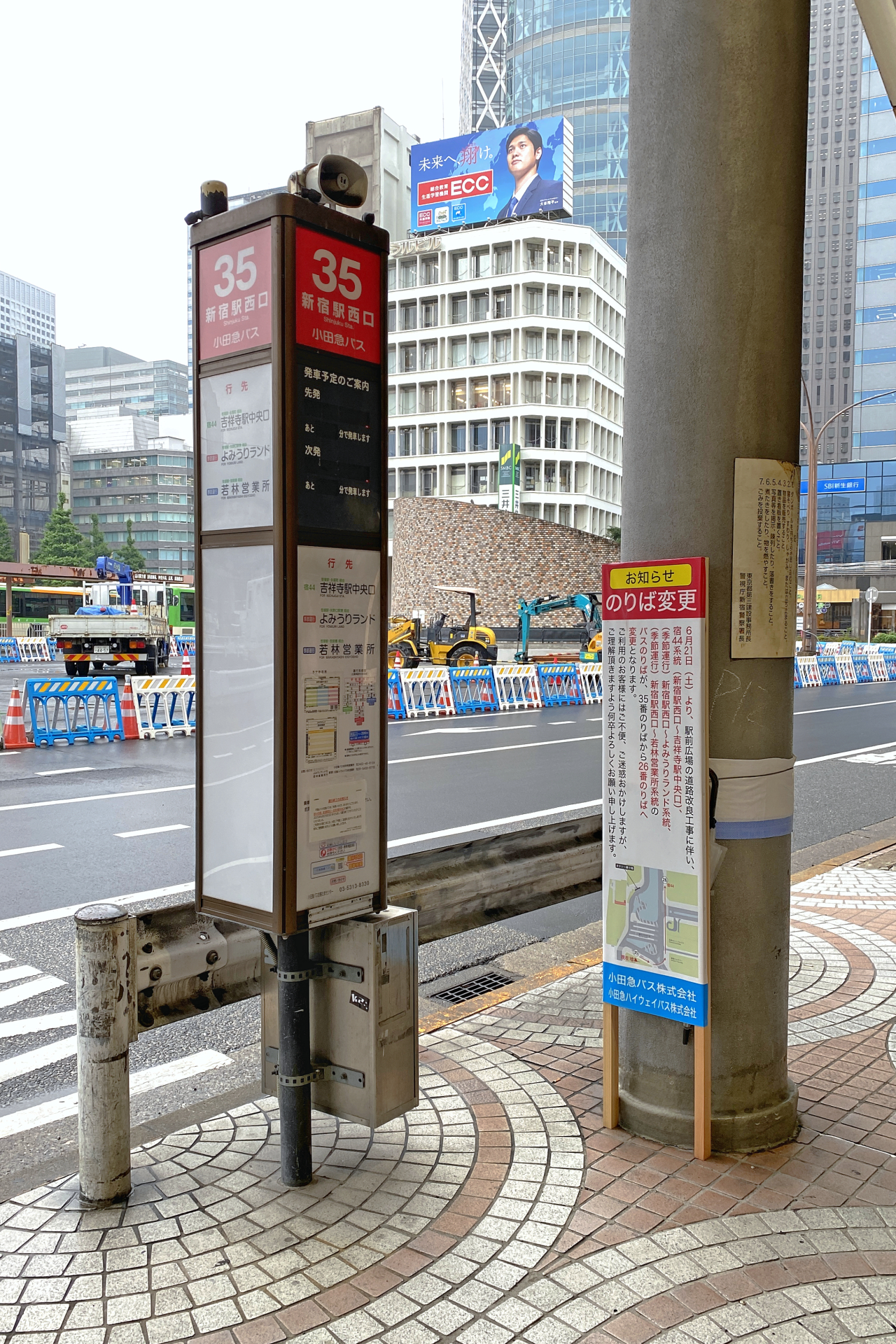 再開発が進められている新宿駅西口では、小田急の駅周辺以外でも様々な動きがあります。新宿西口ハルクの前には沢山のバス乗り場があり、都営バスや京王バス等が発着していますが、6月21日に乗り場の一斉変更が行われる予定です。