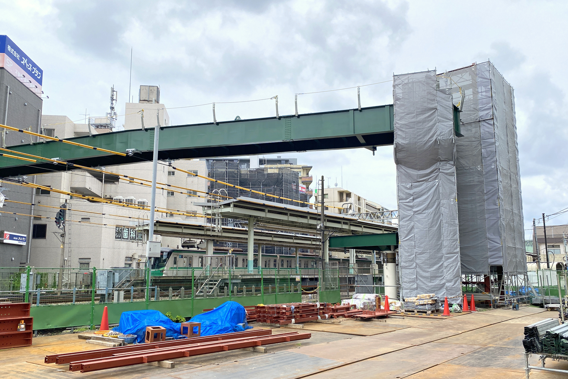 2025年度中の完成に向けて、建設工事が本格化する歩道橋ですが、6月10日に大きな動きがありました。9日の終電後に架橋が行われ、線路の上に歩道橋の床となる部分が見えるようになっています。