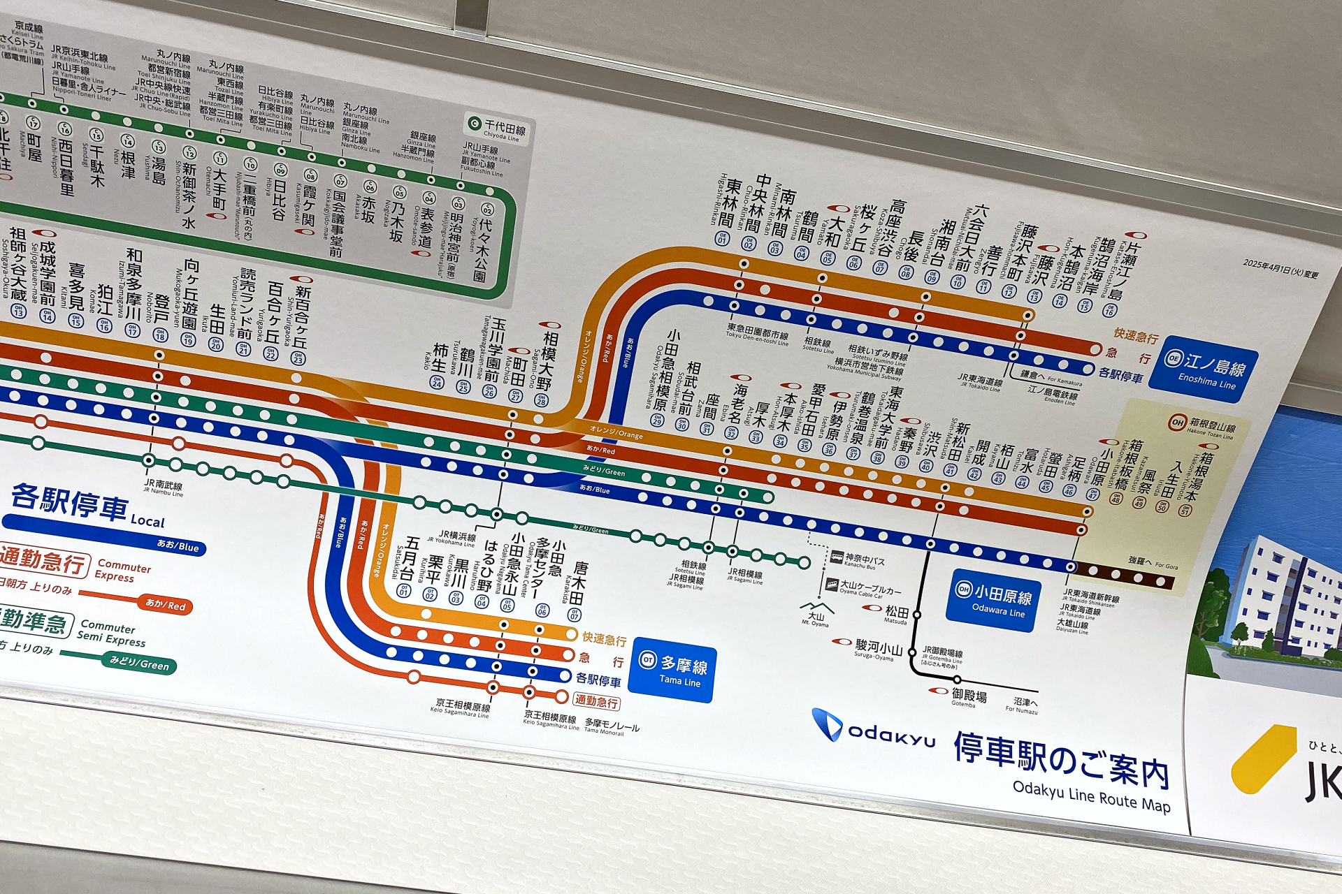 小田急の通勤型車両には、車内に「停車駅のご案内」と書かれた路線図が掲出されています。