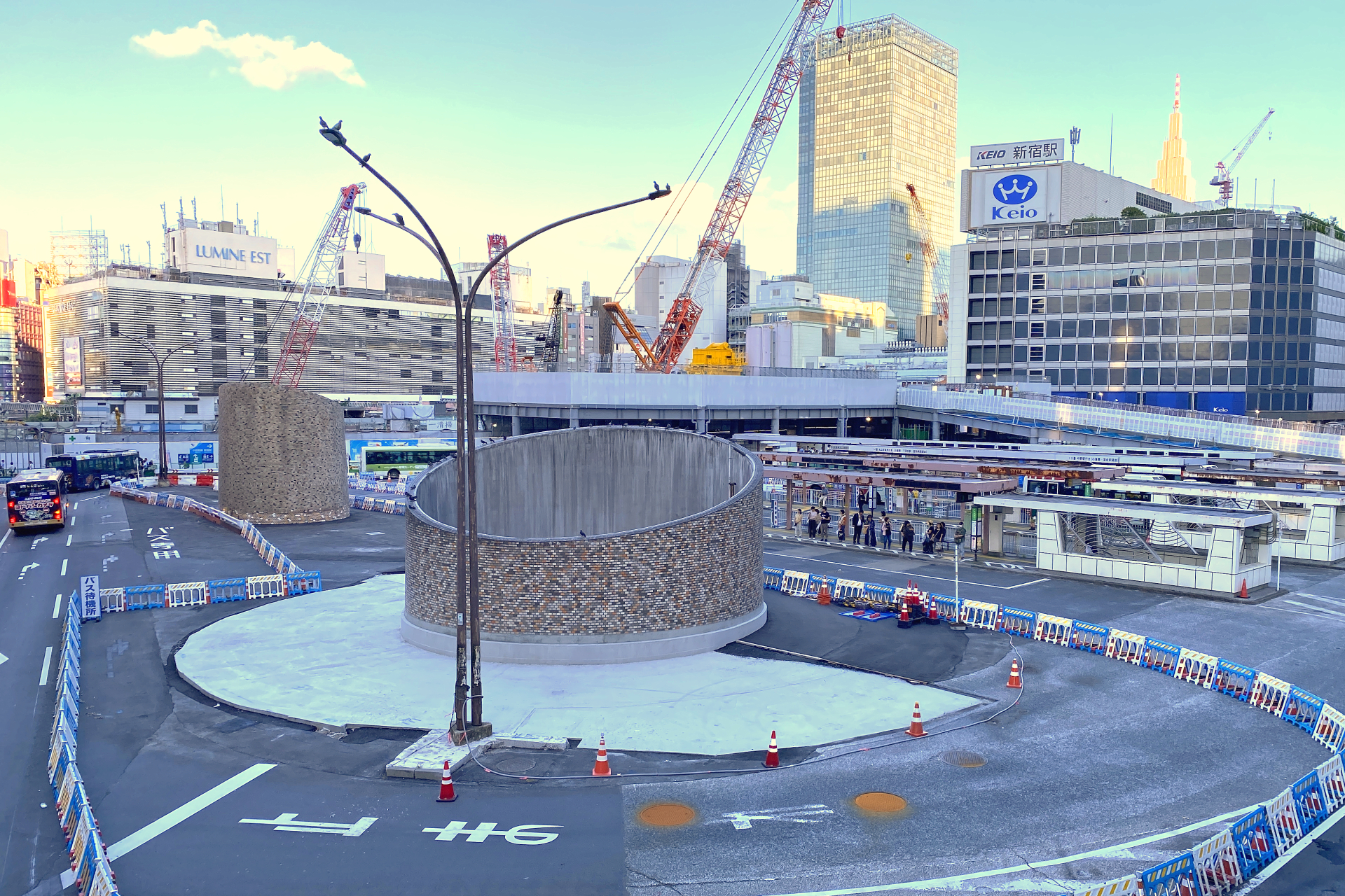 曲線的なレイアウトが印象的な新宿駅西口の駅前広場ですが、その中に大きな塔が4基存在します。これは1966年に完成した換気塔で、地下空間の空気を入れ替えるために設置されており、吸気用と排気用がセットで設置されました。