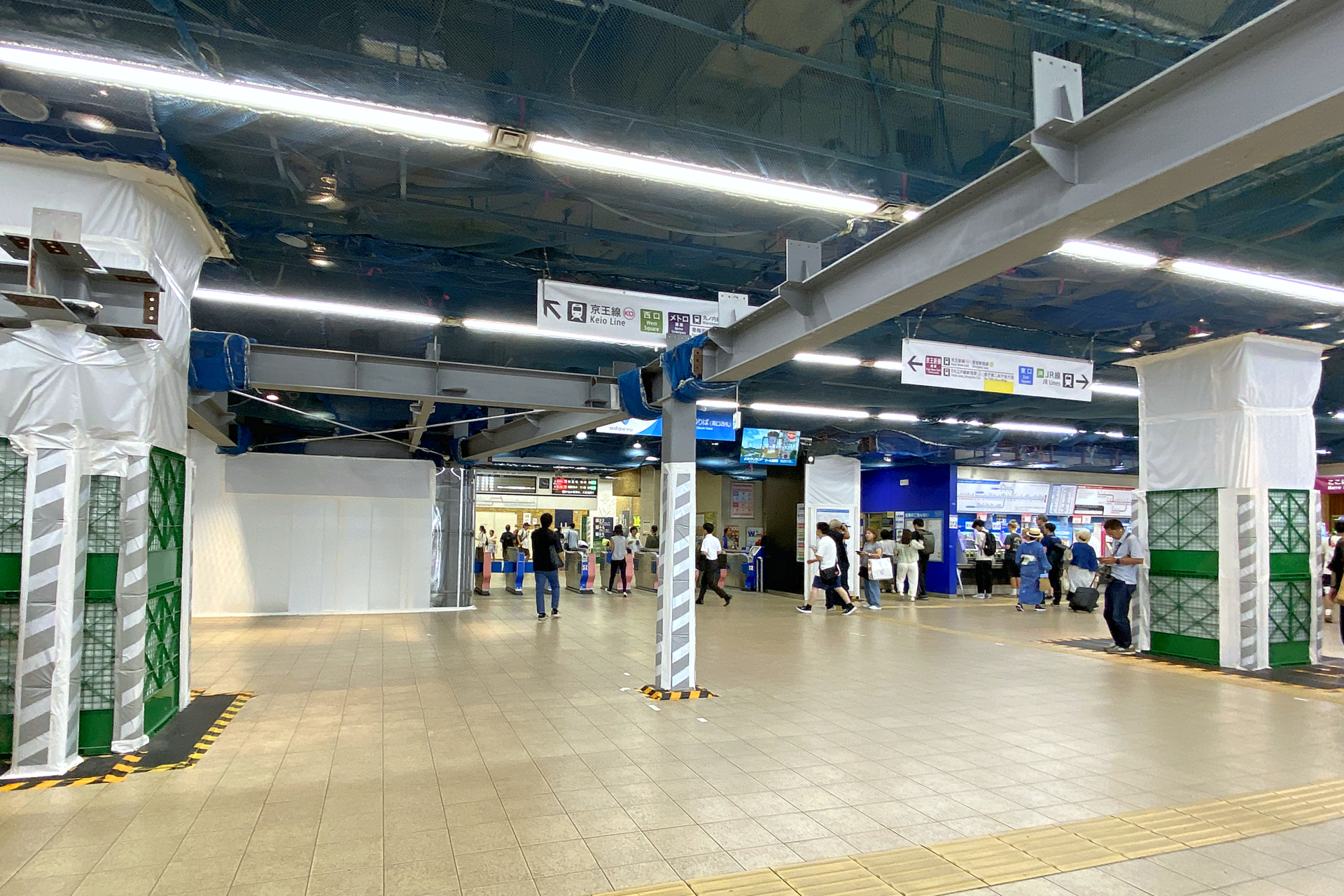 天井は外されつつありましたが、南口改札口は以前の雰囲気を残した状態でした。甲州街道に面しており、JR東日本の改札口とも近いことから、人通りが多いエリアとなっています。