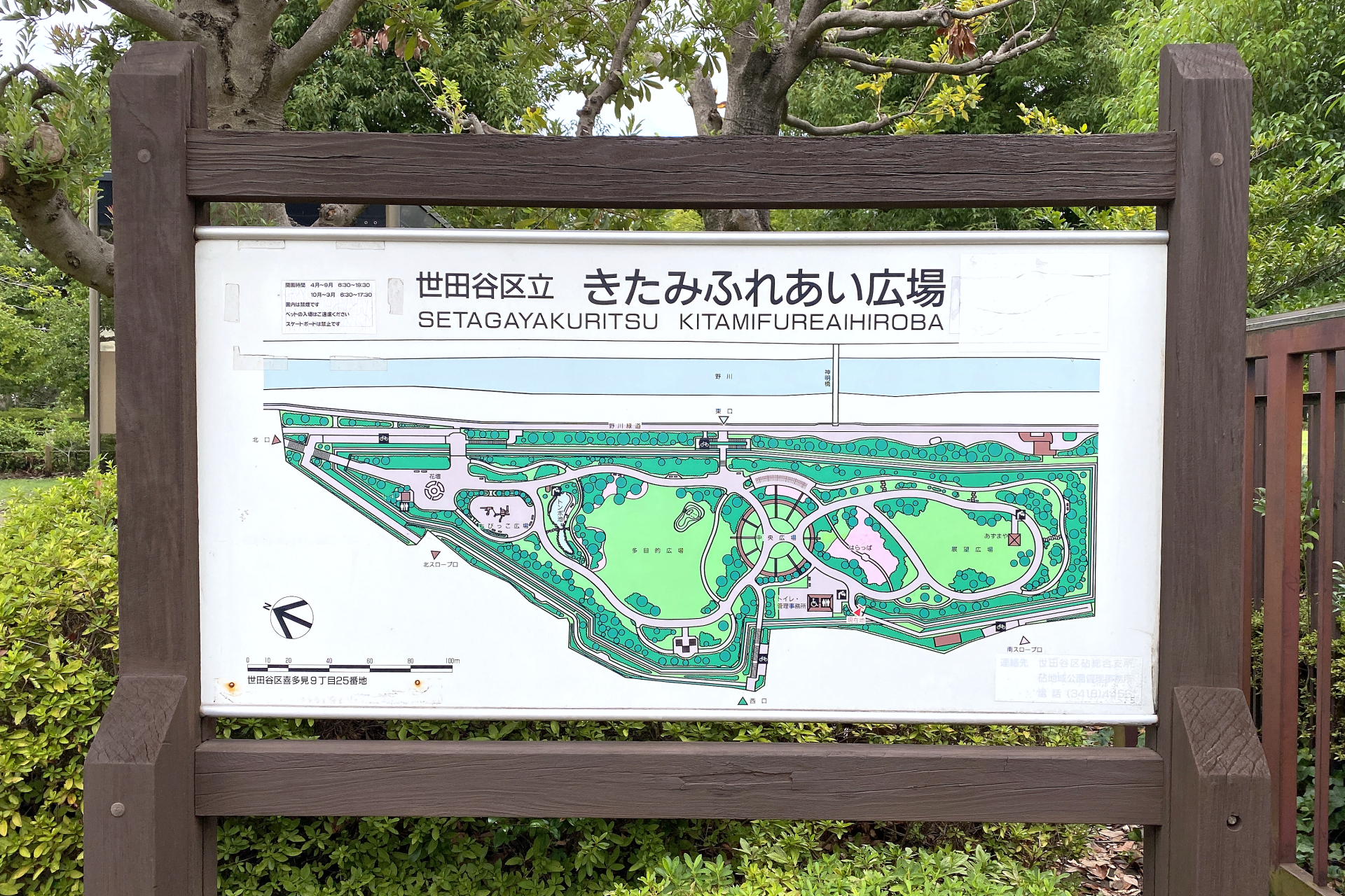 留置スペースの上にあるため、公園自体は細長くなっており、野川に沿うように配置されています。