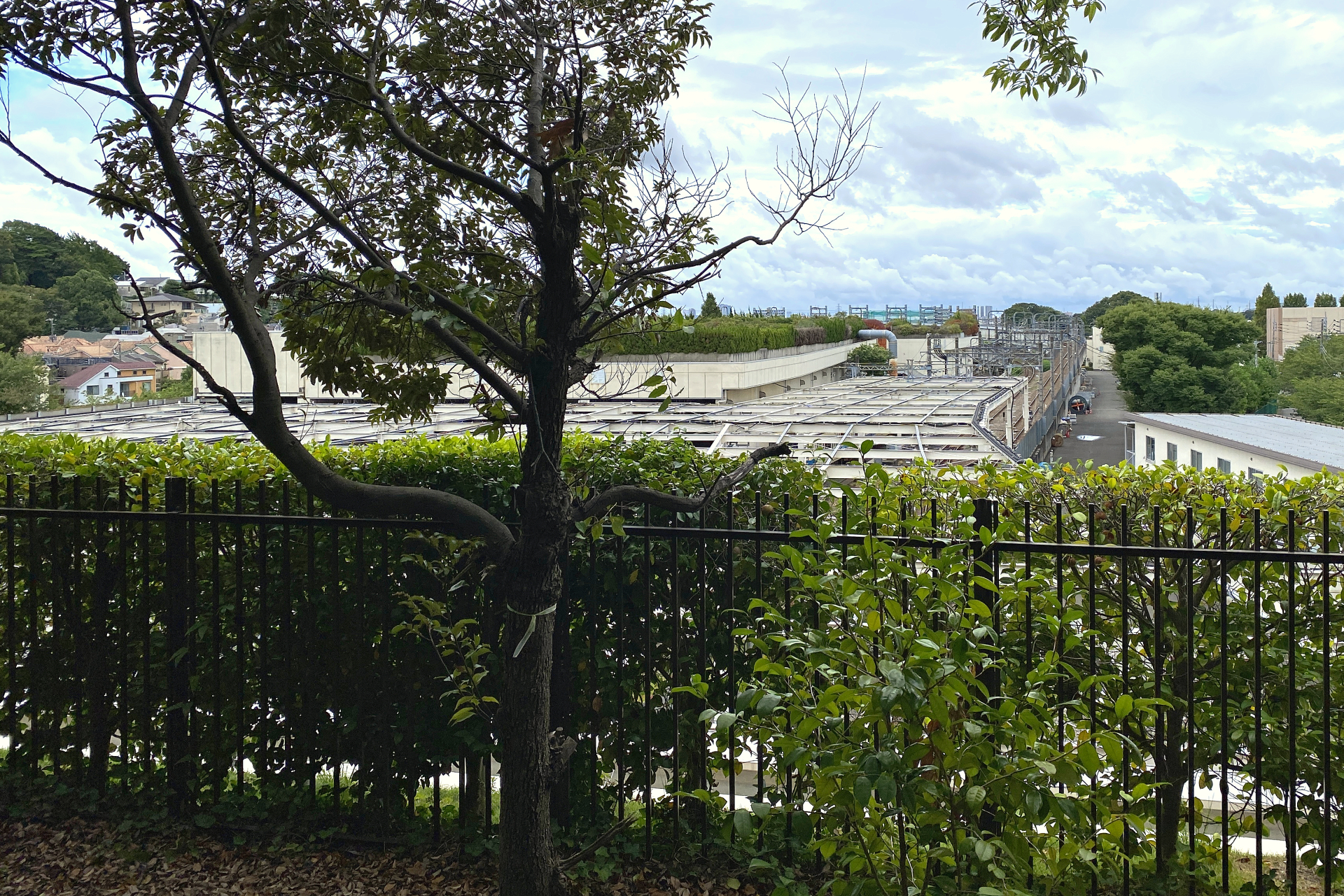 公園の中にいると、そこが人工地盤上であることを忘れてしまいそうになりますが、下では小田急の車両が休んでいます。成城学園前駅での折り返しにも使われるため、比較的車両の出入りは多い場所ですが、公園からはどのように見えるのでしょうか。