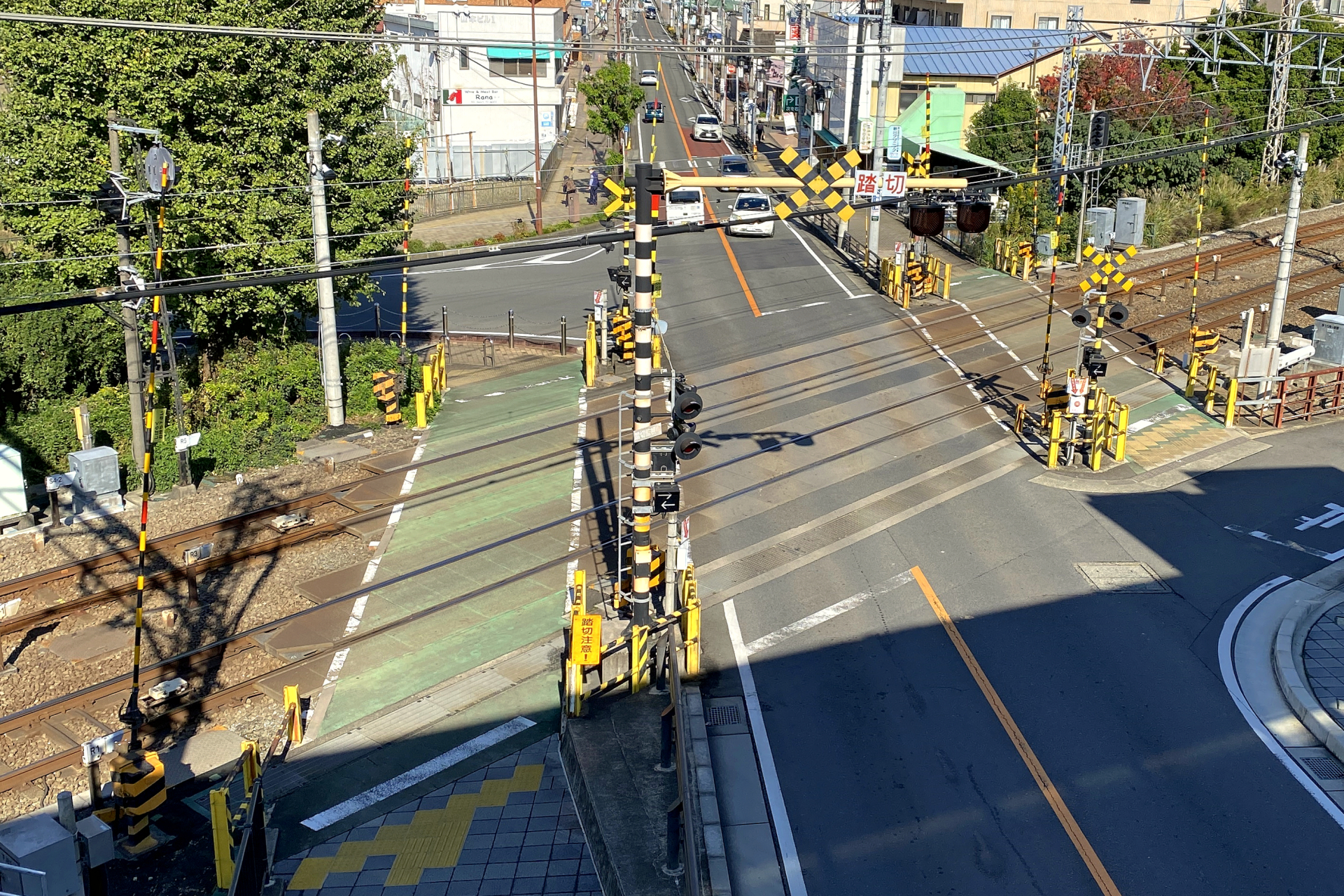 道路の両側に歩道があり、踏切自体の幅も広く、オーバーハング型踏切警報灯等も設置されています。